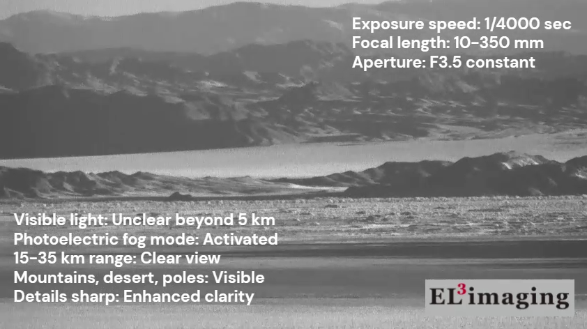 昼間の霧貫通: 2つ目の動画は砂漠で撮影され、光電霧モードで25kmまでの霧貫通能力を示します。